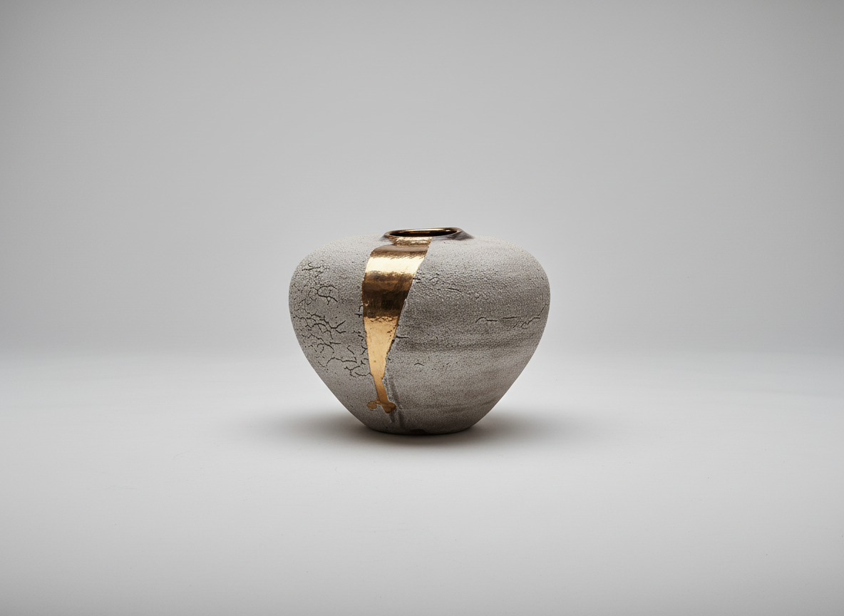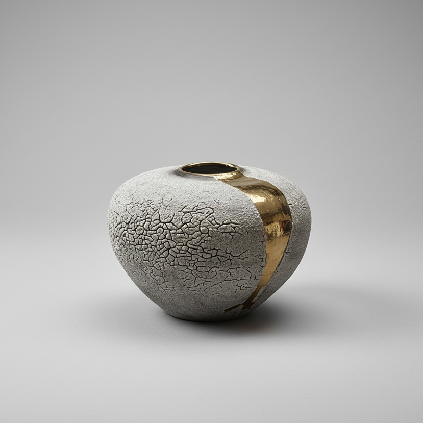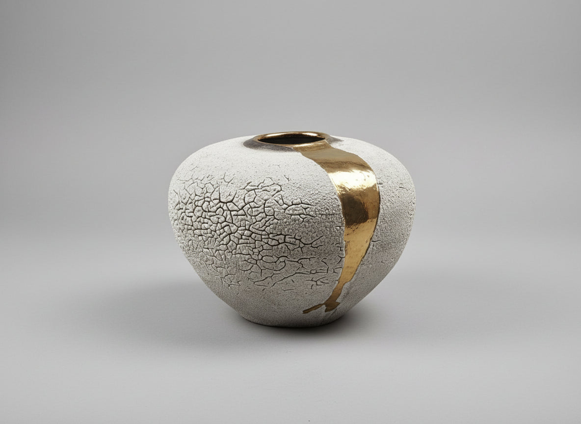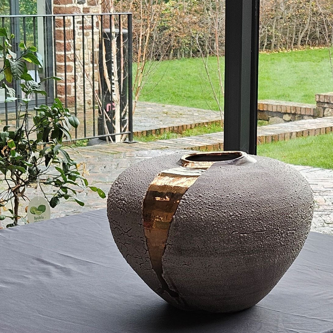 "Flow" is a large stoneware moon jar with grey lichen glaze and a gold lustre drift.