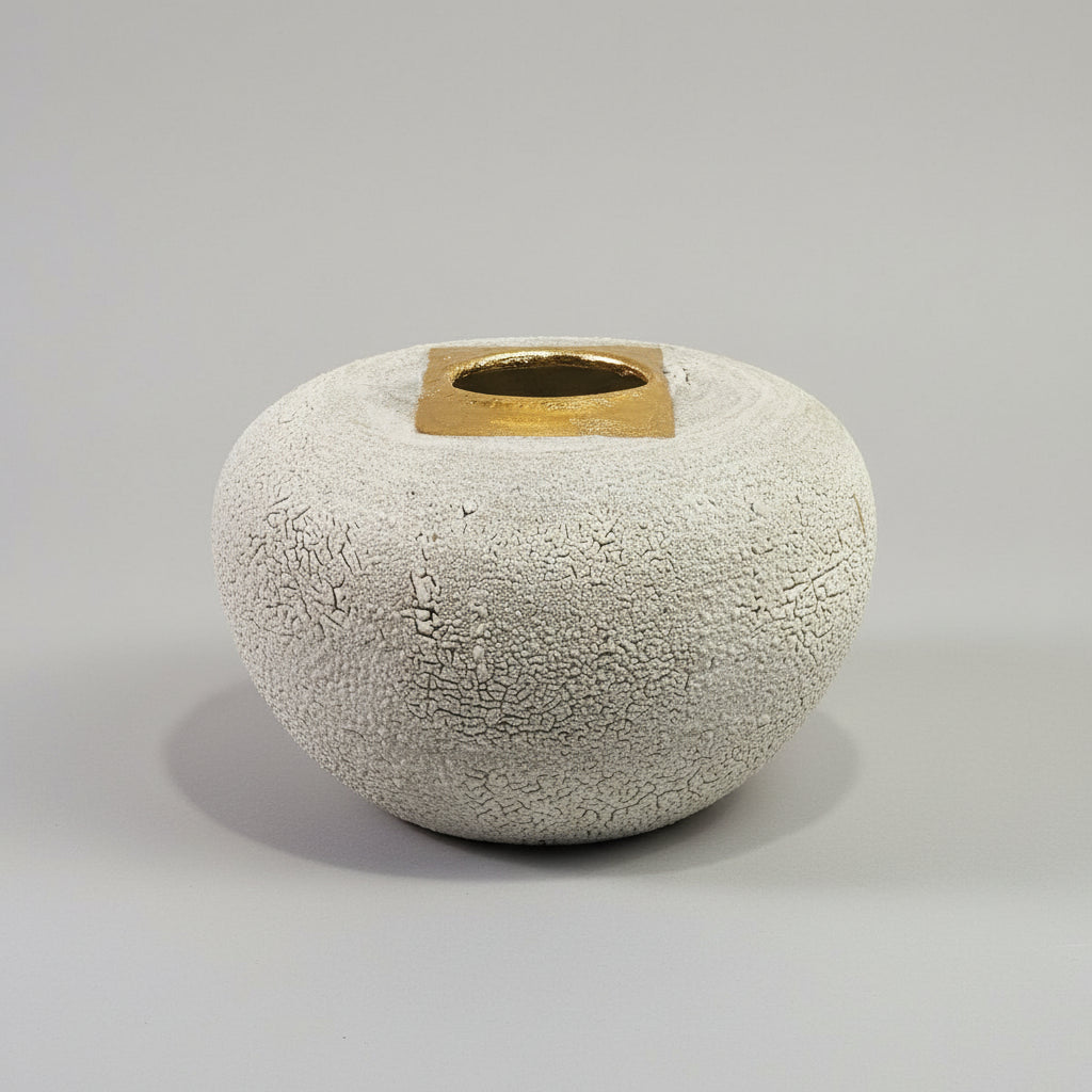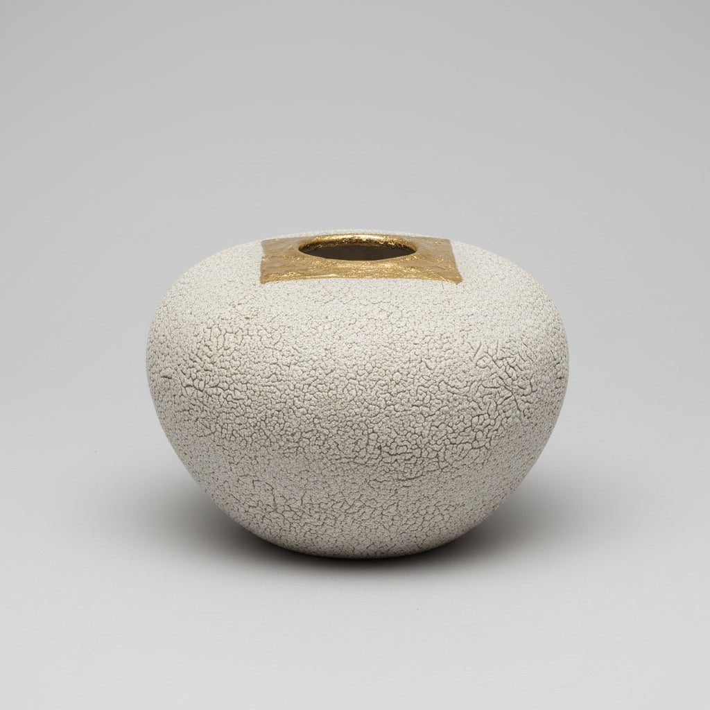 "Gold square" is a large stoneware moon jar with grey lichen glaze and a gold lustreInset.